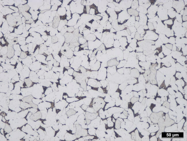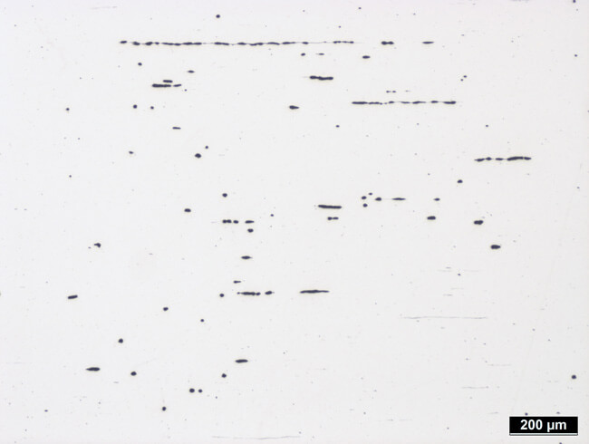 Über eine metallografische Analyse können wir die Perlit- und Ferrit-Anteile bestimmen, die Perlit-Strukturen einordnen und Verunreinigungen wie zum Beispiel Mangan-Sulfide bewerten. Im linken Bild sind beispielhaft zeilenförmige Mangansulfide zu sehen. Des Weiteren können wir den Wärmebehandlungszustand Ihrer Bauteile oder Halbzeuge überprüfen. Durch Glühen, Härten und Anlassen können bei Stählen unterschiedlichste Eigenschaften eingestellt werden. Diese Zustände können wiederum metallografisch bewertet werden um Rückschlüsse auf das jeweilige Verfahren und mögliche Wärmebehandlungsfehler zu erlangen. Das rechte Bild zeigt ein normalisiertes Gefüge eines S235 (früherSt37).