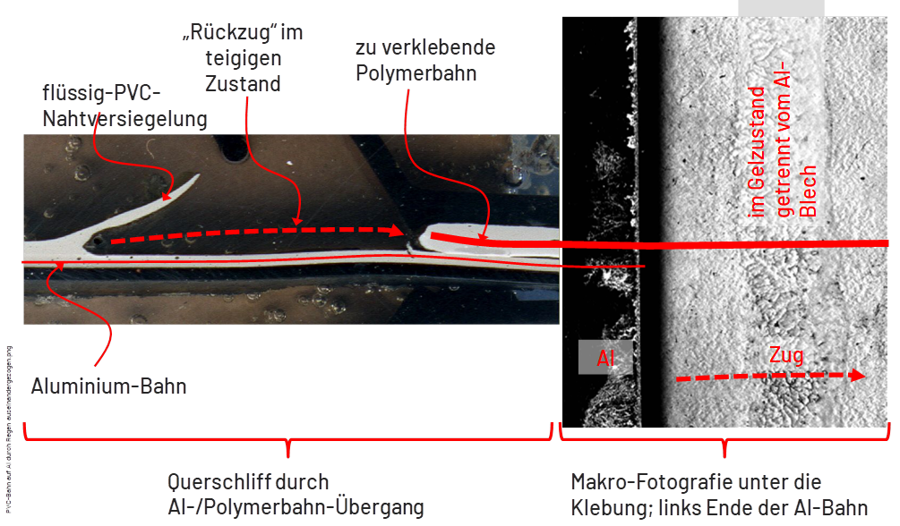 Auf einem Flachdach wurde an das Aluminiumblech eine Kunststoffdachbahn angeschlossen und ordnungsgemäß verklebt, inkl. Nahtabdichtung. Nur: ein Sommer-Regen hat die Polymerbahn und das Aluminium so stark abgekühlt, dass die noch nicht fertig abgelüftete Klebung noch teigig war und die entstandenen Zugkräfte durch das Zusammenziehen der Materialien nicht mehr aufnehmen konnte. Unsere Materialografie lieferte die Beweise, siehe Bild. Zur Info: α = Längenausdehnungskoeffizient [10-6 K-1] von Aluminium beträgt ca. 11, der einer Polymerbahn ca. 100; in anderen Worten ein Temperatursturz von 30 °C erzeugt bei einer 10 m langen Polymer-Dachbahn ein Zusammenziehen von ca. 3 cm!